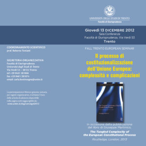 Il processo di costituzionalizzazione dell’Unione Europea 10/12/2012 All'interno del ciclo “Fall Trento European Seminar”, giovedì 13 dicembre 2012, dalle ore 9:15 alle 12:15, si terrà l'incontro dal titolo: "Il processo di costituzionalizzazione