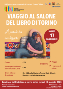 Al Salone del Libro con la biblioteca di Lavis redazione 10/05/2025 La biblioteca di Lavis, in collaborazione con l’agenzia viaggi Bolgia di Trento, organizza il viaggio al Salone del Libro di Torino. Sabato 17 maggio, partenza alle
