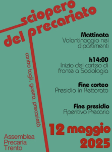 Il 12 maggio l’Assemblea Precaria Trento invita allo sciopero dei precari Ludovica DeAngelis 11/05/2025 Il 12 maggio alle ore 14:00 l’Assemblea Precaria di Trento invita alla partecipazione allo sciopero dei precari, che partirà con il corteo di fronte a