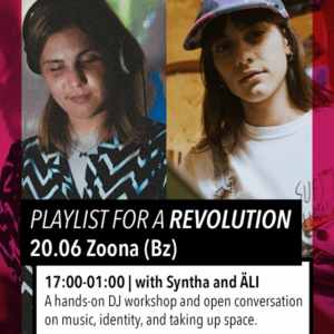 A Bolzano Playlist for a revolution Francesca Re 17/06/2025 Il 20 giugno a Bolzano (a Zoona) le DJ Syntha e Äli condivideranno i loro percorsi, offrendo spunti su come trovare il proprio sound e