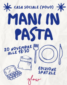 Un nuovo incontro di Mani in Pasta Ludovica DeAngelis 14/11/2025 Giovedì 20 novembre alle ore 18:30, presso la Casa Sociale di Povo, si terrà un nuovo incontro di Mani in Pasta, il workshop organizzato dall’Associazione