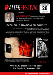 Occhi sulla guerra: il fotoreporter Livio Senigalliesi a Rovereto Giada Vicenzi 27/01/2026 Mercoledì 28 gennaio alle 20:30, AlterFestival ospita il fotoreporter e giornalista Livio Senigalliesi presso la sede di via Orefici 9 a Rovereto. Celebre per le