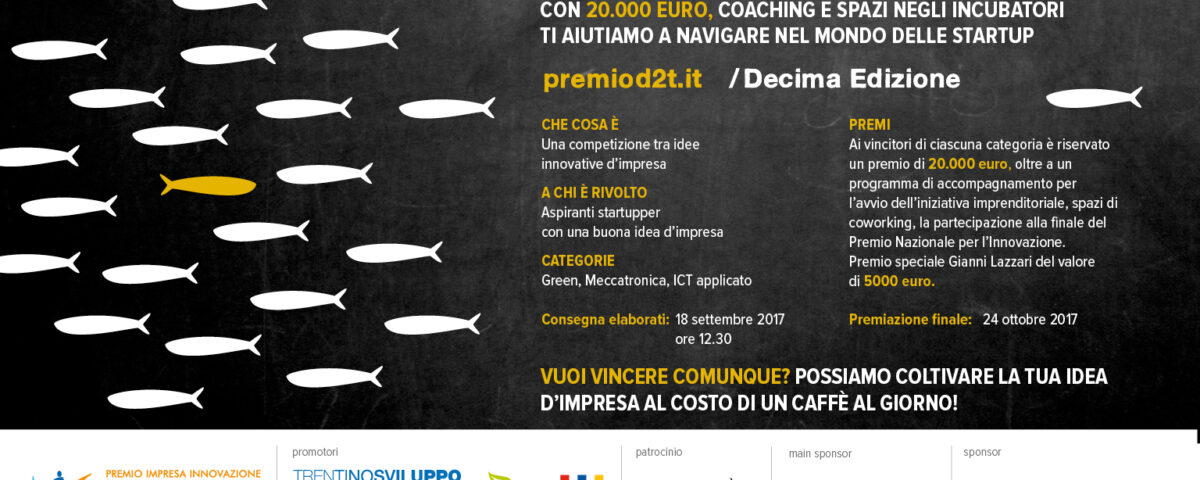 Il progetto “D2T Start Cup” non è nuovo e, nel corso degli anni, ha avuto modo di dimostrare la sua concreta efficienza, giungendo ormai alla decima edizione. Il suo intento è quello di sostenere e accompagnare giovani startupper nella fase iniziale del loro progetto, ossia dallo sviluppo dell’idea imprenditoriale alla sua concretizzazione. Il concorso, promosso da Trentino Sviluppo in collaborazione con HIT-Hub Innovazione Trentino, è aperto a team composti da almeno due partecipanti senza limiti d’età, che presentino un progetto imprenditoriale nell’ambito della meccatronica, delle green tech o dell’ICT. I vincitori di ciascuna categoria riceveranno un premio in denaro del valore di 20.000 euro, nonché la possibilità di accedere gratuitamente ad un periodo di pre-incubazione della durata di un anno in uno degli hub tematici di Trentino Sviluppo (Polo Meccatronica e Progetto Manifattura a Rovereto e Hub Innovazione Trentino a Trento). Tutti in finalisti del Premio D2T Start Cup si contenderanno inoltre il Premio speciale Gianni Lazzari promosso dal Distretto tecnologico trentino Habitech del valore di 5.000 euro e potranno iscriversi gratuitamente all’Innovation Academy, l’accademia per aspiranti e neoimprenditori promossa da Trentino Sviluppo. Per i vincitori un biglietto per Napoli dove dal 30 novembre parteciperanno alla finale tricolore del Premio Nazionale Innovazione.