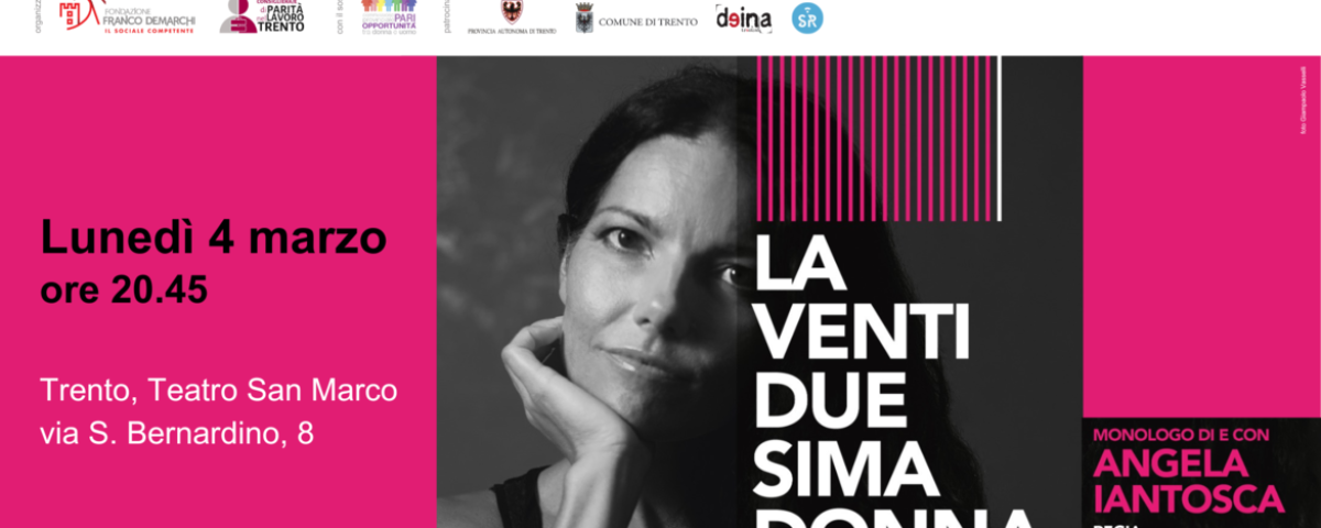 Nel monologo “La Ventiduesima Donna”, la giornalista e scrittrice Angela Iantosca racconta il mondo degli ultimi, del disagio, dei figli delle mafie, del carcere, di chi resiste nonostante tutto e di chi davvero incarna nelle sue scelte quotidiane i principi della Costituzione. Lo spettacolo, per la regia di Gabriele Manili, andrà in scena lunedì 4 marzo alle 20.45, al teatro San Marco di Trento in via Bernardino 8.