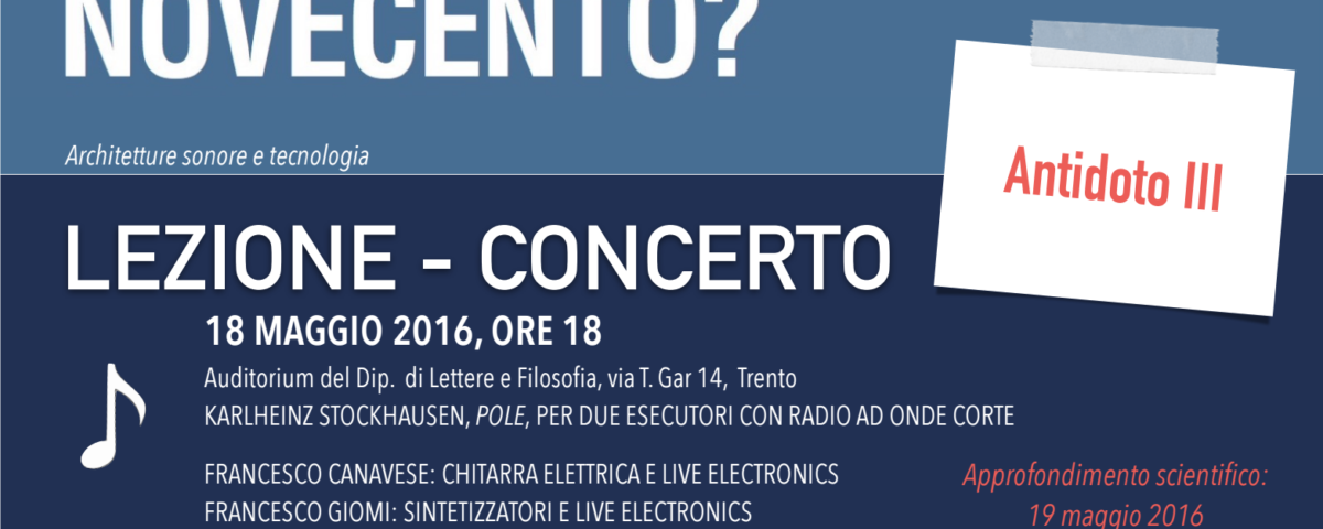 Terzo appuntamento dell’iniziativa “Chi ha paura del Novecento? Scienza e musica di ieri: quattro antidoti alla diffidenza”. Mercoledì 18 maggio alle ore 18:00 presso l’Auditorium del Dipartimento di Lettere e Filosofia dell’Università di Trento. In programma la lezione – concerto dal titolo “Architetture sonore e tecnologia”, che vuole fungere da terzo antidoto alla "paura" per il Novecento.