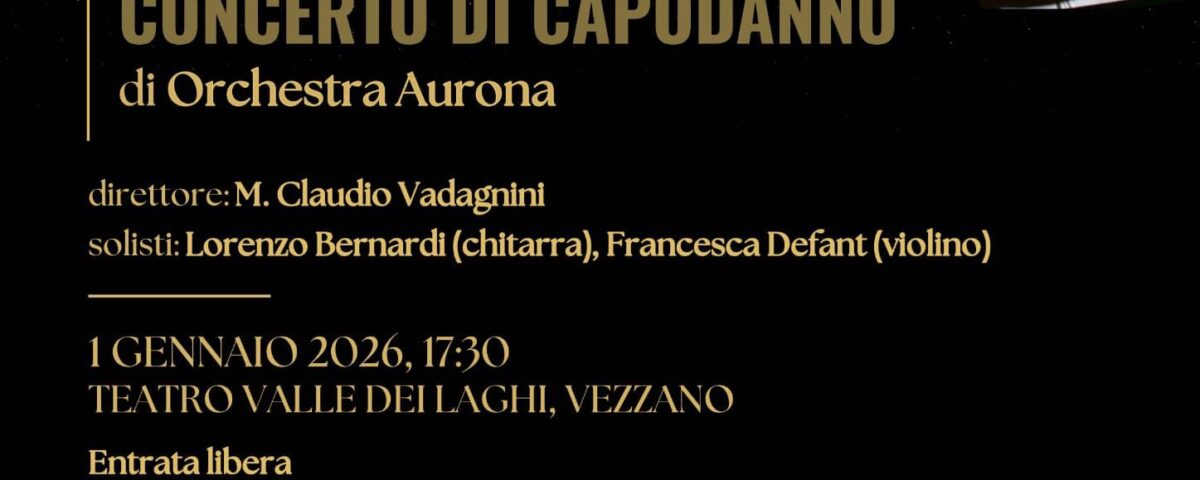 Giovedì 1 gennaio 2026 alle 17.30 il Teatro Valle dei Laghi di Vezzano ospita “Confronti – Concerto di Capodanno” dell’Orchestra Musicale Aurona. Diretta dal maestro Claudio Vadagnini, con i solisti Francesca Defant al violino e Lorenzo Bernardi alla chitarra, l’esibizione propone un viaggio tra stili e linguaggi musicali diversi. Ingresso libero per iniziare il nuovo anno all’insegna della musica.