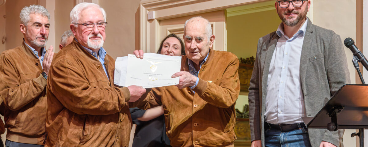 Protagonisti della serata sono stati il tenore Luigino Mazzonelli, premiato per 50 anni di appartenenza al Coro, e tre soci benemeriti con 85 anni continuativi nella SAT: Bruno Angelini, Alberto Inzigneri e Roberto Rigatti. Un traguardo raro, che racconta una vita intrecciata alla montagna e ai valori dell’associazione.