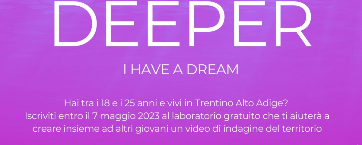La terza edizione del progetto video “Deeper”, organizzata da Fondazione Franco Demarchi nell’ambito del programma formativo delle politiche giovanili della Provincia autonoma di Trento, vuole partire dall’assunto che ogni processo di trasformazione – sociale, civile, artistico, ecc. – si innesca grazie ad un messaggio di valore, un sogno, che può potenziarsi facendo sintesi delle visioni personali di ognuno, puntando ad un obiettivo comune che è necessario alimentare non solo con idee, ma anche attraverso consapevolezza, conoscenza e operando in gruppo. Il progetto quest’anno vuole offrire l’opportunità a 10 giovani di accrescere le proprie competenze nell’ambito del videomaking, partecipando ad un laboratorio di avvicinamento agli approcci della ricerca sociale e del racconto per immagini in movimento con esperti – tra cui la regista Cecilia Bozza Wolf – che li condurranno, in gruppi, a indagare questioni sentite da quelle giovani generazioni che vivono in periferie cittadine e/o vallate a rischio spopolamento. La finalità è coprodurre uno o più video che ne siano testimonianza diretta e che partano da idee condivise da parte dei giovani promotori. Ad esempio potranno essere affrontate tematiche come la fuga dai territori periferici di montagna, la questione del tempo libero e del divertimento in valle, il vivere da protagonisti il proprio territorio, il rapporto con la natura, ecc..