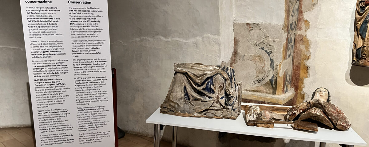 Nel 1975 l’opera fu rubata e successivamente ritrovata dai Carabinieri sulle rive dell’Adige, ormai danneggiata e priva della figura del Bambino. L’esposizione agli agenti atmosferici e interventi non idonei hanno causato gravi danni strutturali e la perdita di gran parte della policromia originale. Da oggi, grazie al laboratorio di restauro “Stefano Gentili – Conservazione e restauro di beni culturali”, i visitatori potranno assistere in diretta alle delicate fasi di recupero, approfondendo così i temi della tutela e valorizzazione del patrimonio d’arte sacra locale.