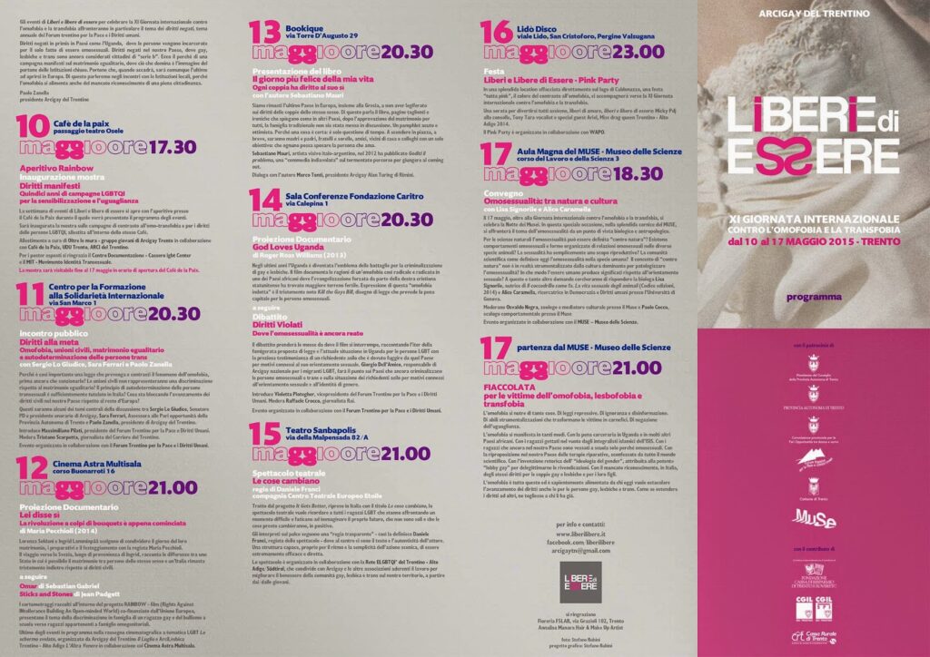 La settimana di Liberi e  libere di si è aperta ieri sera al Cafè de la Paix con l'inaugurazione della mostra "Diritti manifesti. Quindici anni di campagne LGBTQI per la sensibilizzazione e l'uguaglianza" e proseguirà con un ricco programma di incontri, dibattiti, proiezioni e momenti di festa. L'appuntamento cloud di partecipazione sarà la fiaccolata per le vittime dell'omofobia, lesbofobia e transfobia che chiude la settimana, il 17 maggio alle 21 con partenza dal Muse. Un'importante occasione per ricordare chi ha perso la vita e ha subito o subisce quotidianamente discriminazioni per un diritto negato, quello di essere liberi e libere di essere e di amare.