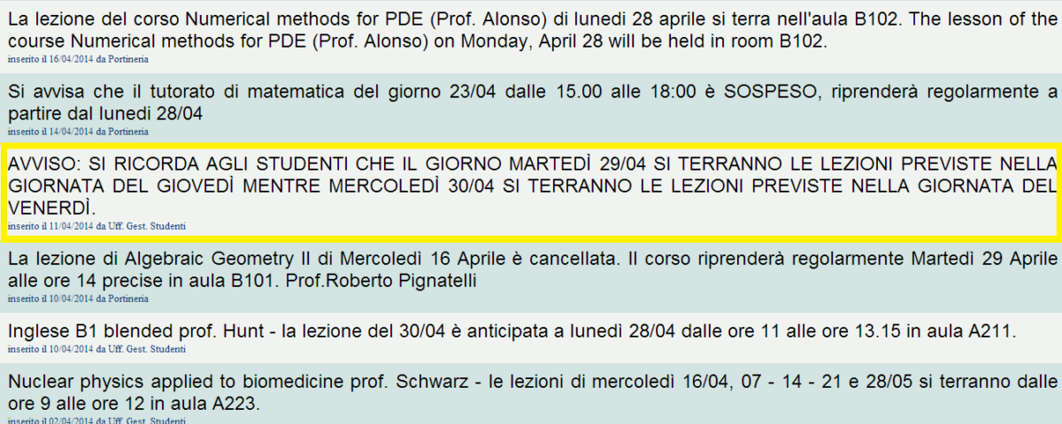 Martedì 29 e mercoledì 30 gli studenti di Povo vedranno le loro giornate sconvolte, vivranno le ventiquattro del martedì nella convinzione che si tratti di un giovedì e mercoledì convinti che si tratti di venerdì. Non avete capito cosa vuol dire? Poiché a causa di ponti e festività varie si perdono consecutivamente tre giovedì e venerdì di lezione ma solamente un martedì e mercoledì, nei giorni del 29 e del 30, per pareggiare i conti e compensare lo squilibrio, si seguiranno gli orari che sarebbero previsti per il giovedì e il venerdì. Questo provvedimento, seppur molto sensato, ha creato qualche disagio a studenti e professori che hanno trascorso le ultime giornate a ripete frasi del tipo “No, aspetta..martedì è giovedì quindi finisco alle ore..” oppure “Ma io mercoledì finisco lezione prima perché in realtà è venerdì!” cercando di metabolizzare questo scambio cronologico. Ce la faranno i nostri eroi?