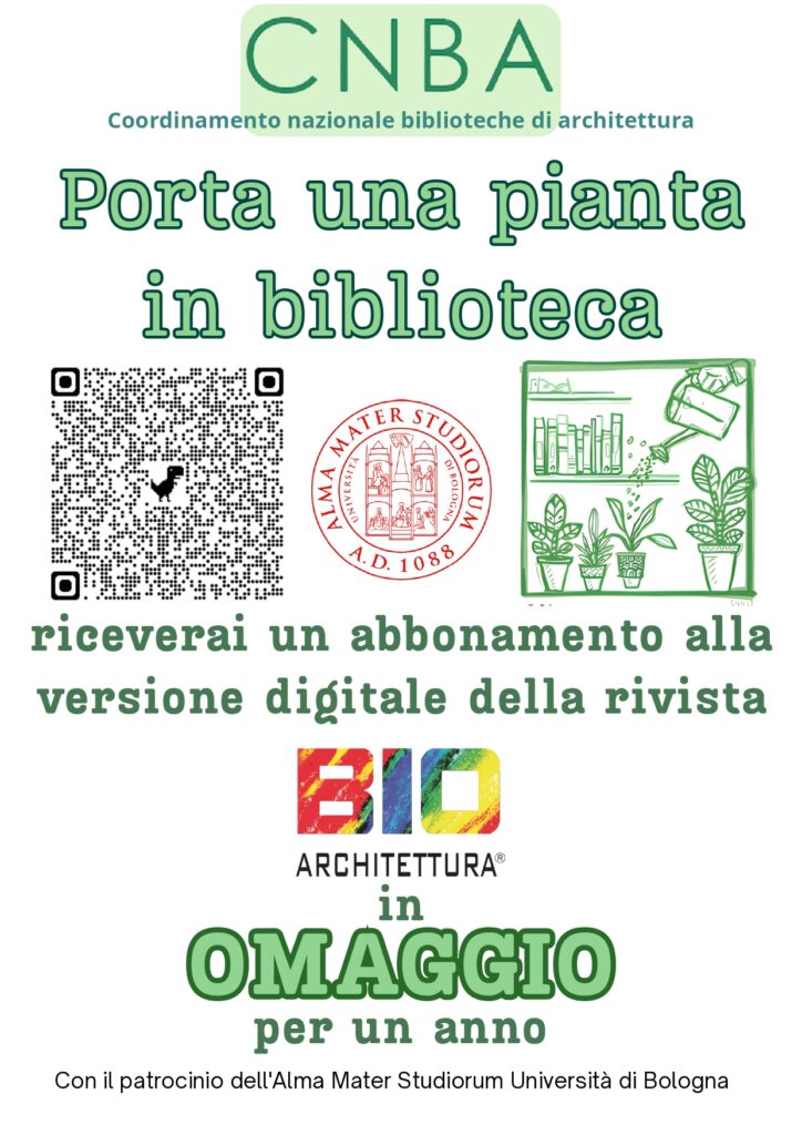 Invitiamo quindi a lasciare una piccola pianta in biblioteca, concordando con il personale le modalità di manutenzione e cura. Chi aderisce all’iniziativa riceverà in omaggio un abbonamento per un anno alla versione digitale della rivista Bioarchitettura.