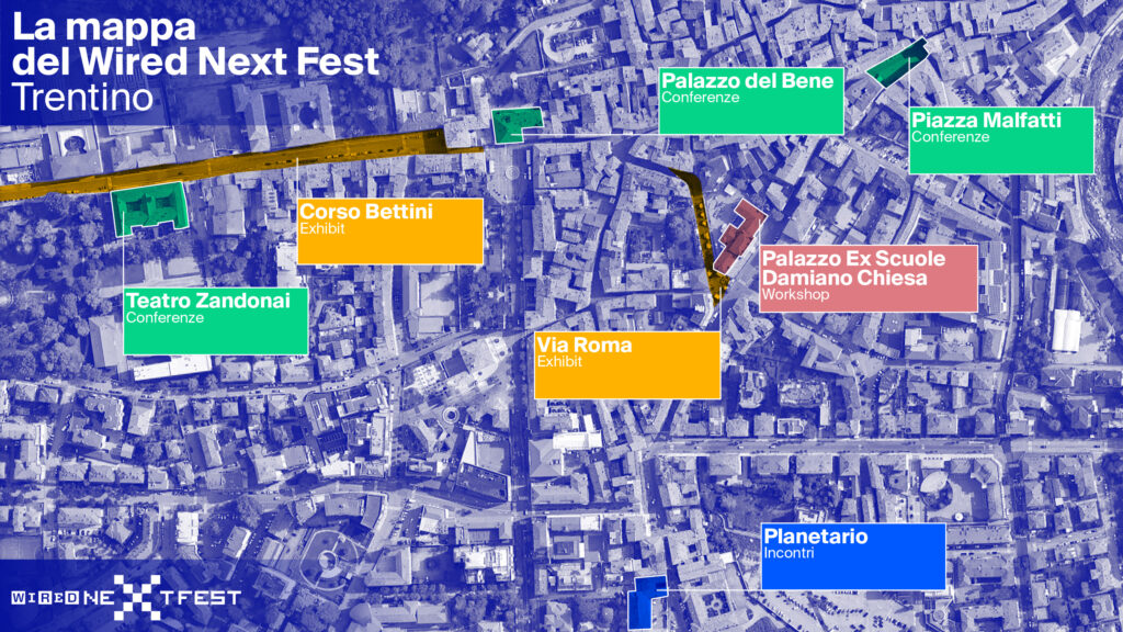 In partnership con la Provincia autonoma di Trento, Trentino Marketing e Trentino sviluppo, e in collaborazione con il Comune di Rovereto e l’Università degli Studi di Trento, Wired Next Fest vi aspetta a Rovereto per riflettere su come le culture e le politiche locali possano influenzare i processi d’innovazione e la nascita di nuove tendenze.