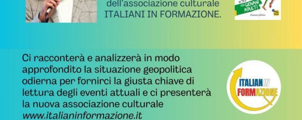 Nel suo intervento Rimondini offrirà un’analisi approfondita dello scenario geopolitico contemporaneo, fornendo strumenti di lettura per comprendere dinamiche e trasformazioni in atto, e presenterà la nuova associazione Italiani in Formazione. L’ingresso è previsto alle ore 14, con inizio alle ore 15. A seguire, aperitivo con l’autore. Partecipazione a offerta libera e consapevole, con prenotazione obbligatoria al 351 7952050.