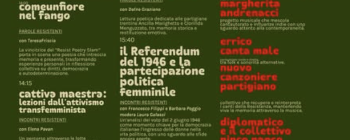 Sabato 25 aprile dalle ore 12:00, presso piazza della Mostra, si terrà la giornata dedicata al 25 aprile organizzata in collaborazione Arci Trentino. Si inizia con una pastasciutta antifascista comunitaria per recarsi tutte e tutti assieme alle 14:00 in San Martino per i workshop e i talk. Alle 17:30 inizieranno i concerti in piazza Mostra.